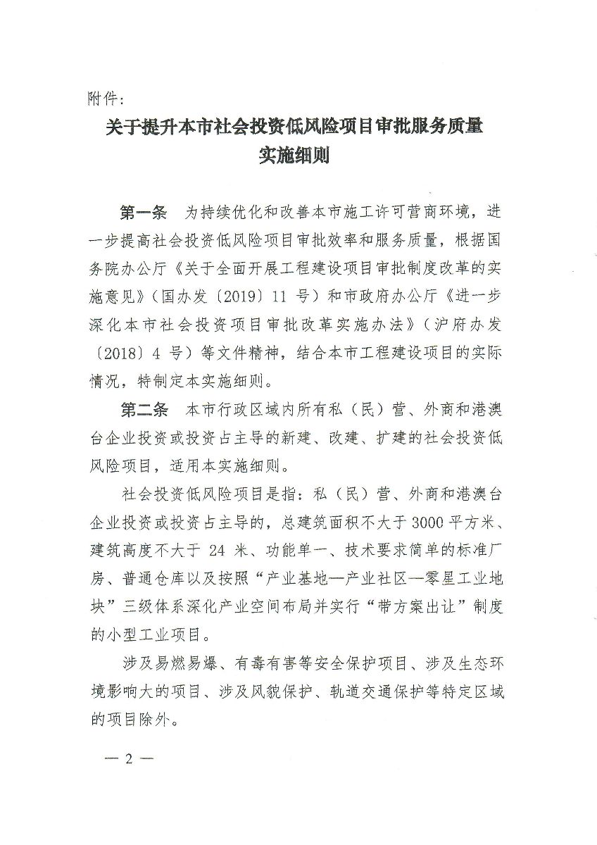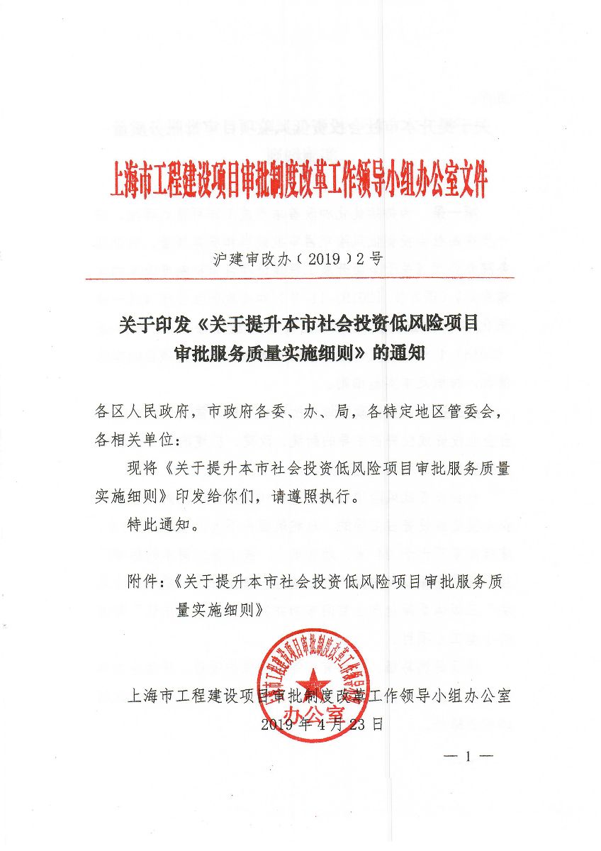 沪建审改办 〔2019〕2号 《关于印发<关于提升本市社会投资低风险项目审批服务质量实施细则> 的通知》